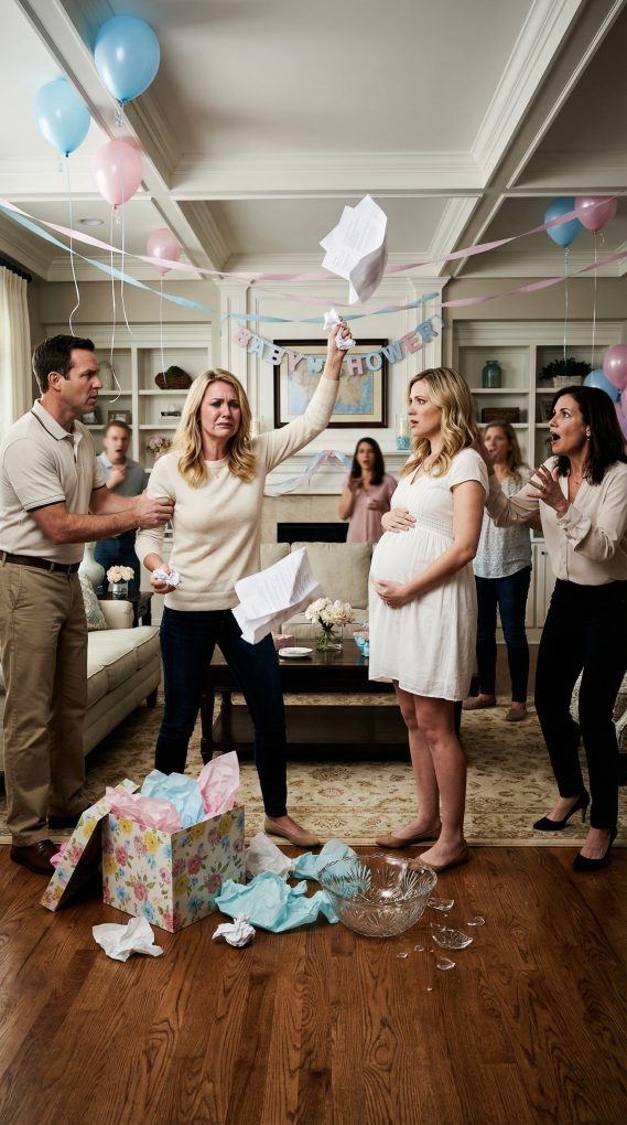 I didn’t confront Luke right away. I went home first and stood in our living room, staring at the framed photos on the wall—our wedding in Savannah, beach vacations, Christmas mornings. Every memory felt staged. When he walked through the door that night, I asked one question. “Is Ava’s baby yours?” He didn’t even pretend not to understand. He just exhaled and sat down like he’d been waiting for this. “It wasn’t planned,” he said. “Claire, we were barely holding it together.” “So you slept with my sister?” I asked, my voice eerily calm. He rubbed his face. “It just happened.” That phrase. The universal excuse of cowards. I laughed once, bitterly. “No. You made a choice.” He didn’t argue. That was worse. I filed for divorce within the week. Ava, meanwhile, continued posting glowing maternity pictures online, captions about “unexpected blessings.” My parents liked every single one. Then came the official invitation. Ivory cardstock, elegant script: “Join us in celebrating Ava and Baby Harper.” Harper. No last name. No acknowledgment. Just a curated version of events where I didn’t exist. My mother called the next day. “Please come,” she urged. “This family has been through enough.” I almost admired her confidence. “I’ll be there,” I replied. She sounded relieved. She shouldn’t have been. In the weeks leading up to the shower, I gathered what I needed—not revenge in the violent sense, but evidence. Text messages Luke had forgotten to delete. Hotel confirmations charged to our shared account. Dates that overlapped with our anniversary trip. A timeline. Facts. Truth. The day arrived warm and bright. Ava’s suburban backyard had been transformed with blush balloons and a mimosa bar. Guests cooed over tiny onesies strung across a clothesline. My parents greeted me stiffly, tension radiating from their forced smiles. “Let’s keep today positive,” my father murmured. Ava approached wearing a flowing pale-blue dress, one hand resting theatrically on her belly. “I’m glad you came,” she said softly, like we were co-stars in a polite drama. Luke stood near the drink table, looking pale but composed. I carried a large white gift box wrapped neatly with a satin ribbon. It was heavier than it looked. When it came time to open presents, Ava beamed at the crowd. “This baby is surrounded by love,” she said. I stood. “Open mine first,” I said clearly. The chatter faded. My parents stiffened. Luke’s jaw tightened. Ava smiled nervously and untied the ribbon.