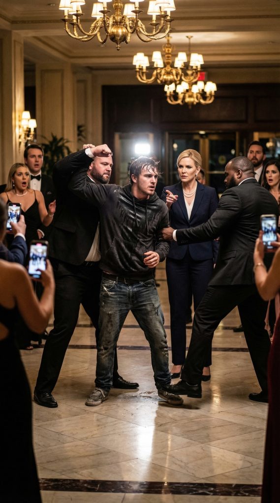 Two guards started toward him at once. Ethan looked around the lobby, ashamed now not for his clothes, but for the cruelty rising in the room around him. A few guests smirked openly. One person even raised a phone to record. Ethan lifted both hands and said, “You’re making a serious mistake.”