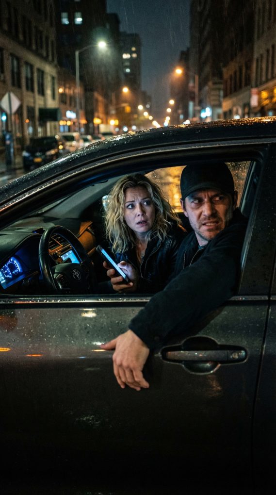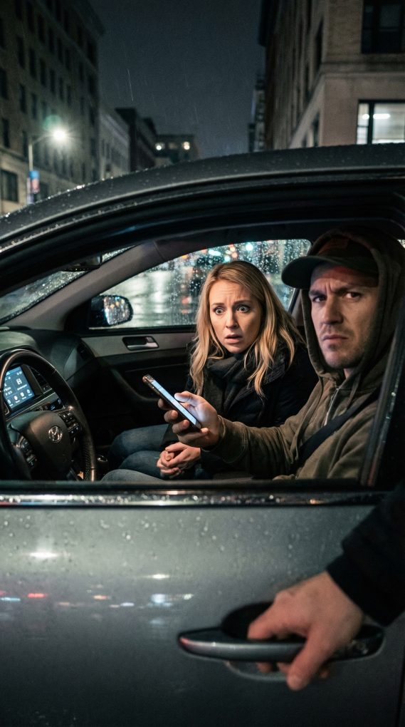 My name is Ashley Monroe, and the night my Uber driver locked the doors may have saved my life. It happened in Chicago, on a cold Friday night after I left a small office party downtown. I had stayed later than most people, chatting with coworkers and finishing a few drinks before deciding it was time to go home. My boyfriend Tyler had texted earlier saying he was already asleep, so I ordered an Uber and waited outside the building. The car that pulled up was a black Honda Accord. The driver’s name on the app was Marcus Hill, a man in his late thirties with tired eyes but a calm voice. I slid into the back seat, greeted him politely, and gave the address of my apartment. The ride started normally. Chicago’s streets were quiet that late at night, only a few cars moving through the intersections while the glow of streetlights reflected off wet pavement. Marcus didn’t talk much, and I didn’t mind. I leaned my head against the window, scrolling through messages on my phone while the car moved steadily through the city. About ten minutes into the ride, Marcus suddenly slowed the car and pulled over beneath a dim streetlamp. Before I could ask why, I heard the sharp click of the door locks engaging. My stomach tightened immediately. “Why did you stop?” I asked, sitting upright. Marcus didn’t answer right away. Instead, he turned halfway in his seat and looked directly at me through the dim interior light. His expression wasn’t angry or threatening. If anything, he looked strangely serious. “You’re not safe going home tonight,” he said quietly. For a moment I thought I had misheard him. “What?” I said sharply. My hand instinctively moved toward the door handle, but it wouldn’t open. Marcus reached into the center console and pulled out another phone. Without raising his voice, he handed it toward me. “Just listen,” he said. Confused and irritated, I took the phone from him. The screen was already open to an audio recording. I pressed play. Two men were talking in the recording. The first voice sounded unfamiliar. But the second voice made my blood run cold instantly. Because it belonged to Tyler.