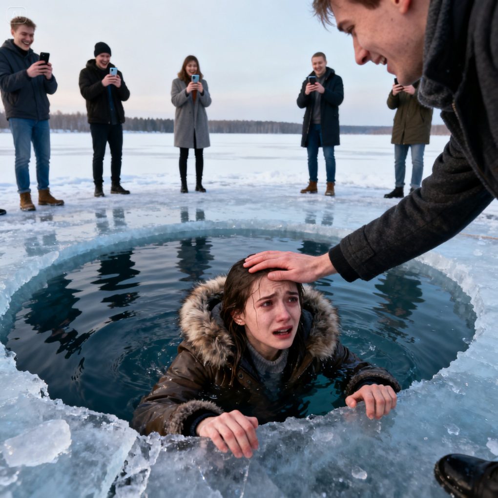 Emily’s in-laws—the Harrington family, known for their wealth and cruelty wrapped in polished smiles—were gathered at the edge of the lake. Two of her husband’s cousins shoved her toward the thin ice while another filmed on his phone. Her husband, Evan, stood quietly, recording every second with a cold, blank expression.