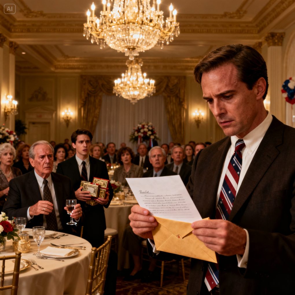 His face went ghost-white. His hand trembled. The glass of champagne slipped from his fingers and shattered on the floor.