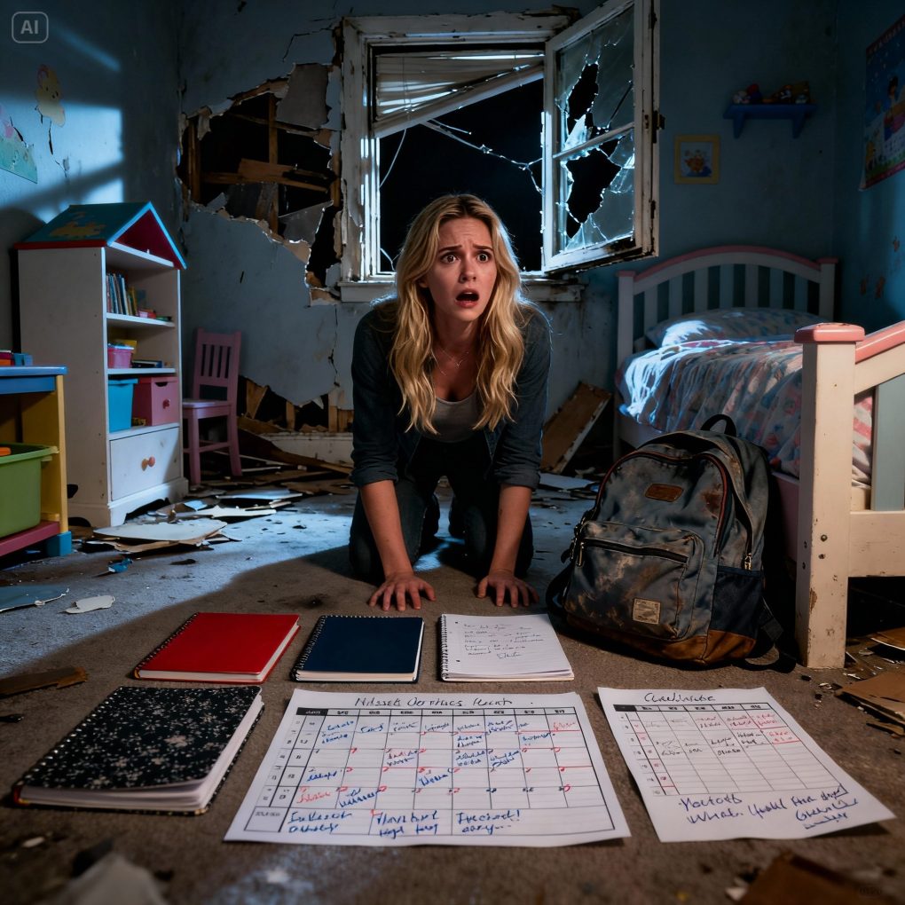 Her breath caught. The room was unrecognizable: her bed dismantled, drawers emptied, walls stripped. But what froze her in place was the cluster of items arranged carefully on the floor—items that should not have been there. A backpack identical to hers. Notebooks with her handwriting. A sweater she had lost last semester. And on the desk, a printed schedule from her college… with handwritten notes tracking the times she left and returned to her dorm.
