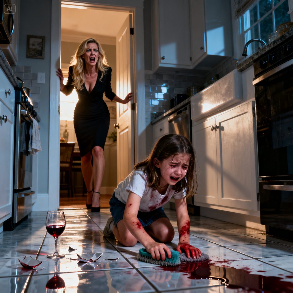 When Emily Carter returned from her business trip two days early, she expected nothing more than a quiet evening, maybe a rushed dinner of leftovers and a long shower. Instead, she stepped into the house and froze. Her 9-year-old daughter, Lily, was kneeling on the cold kitchen tiles, scrubbing so hard that her small hands were raw and bleeding.