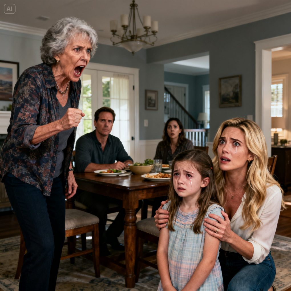 Before dinner, my mother-in-law choked on a fish bone but still screamed at my 7-year-old daughter: “You’re bad luck! You’re not having dinner! Go to bed now!” My husband said nothing. I just smiled and replied, “We’re not eating. Thank you.” My mother-in-law growled, “Stop acting up. You two freeloaders should be grateful.” I didn’t shed a tear. I went upstairs, grabbed a piece of paper, came back down, and said, “All of you need to get out of my house right now before I call the police.” They froze, every face turning white…