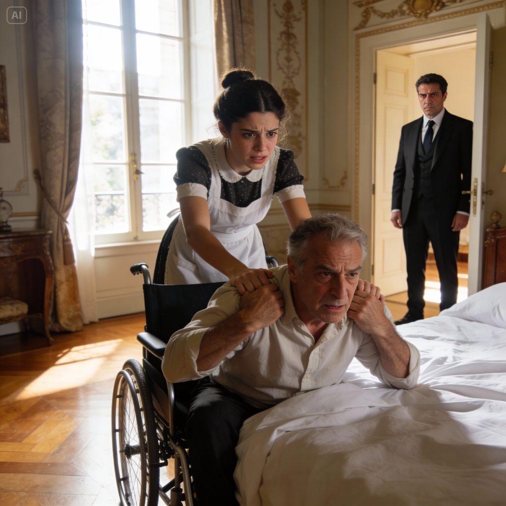 Allí, arrodillada frente a su padre, estaba Lucía, la joven criada recién contratada. Tenía las manos sobre el torso del anciano, inclinada tan cerca que sus rostros casi se tocaban. Don Esteban respiraba agitadamente, aferrado al brazo de la chica como si buscara sostenerse.
