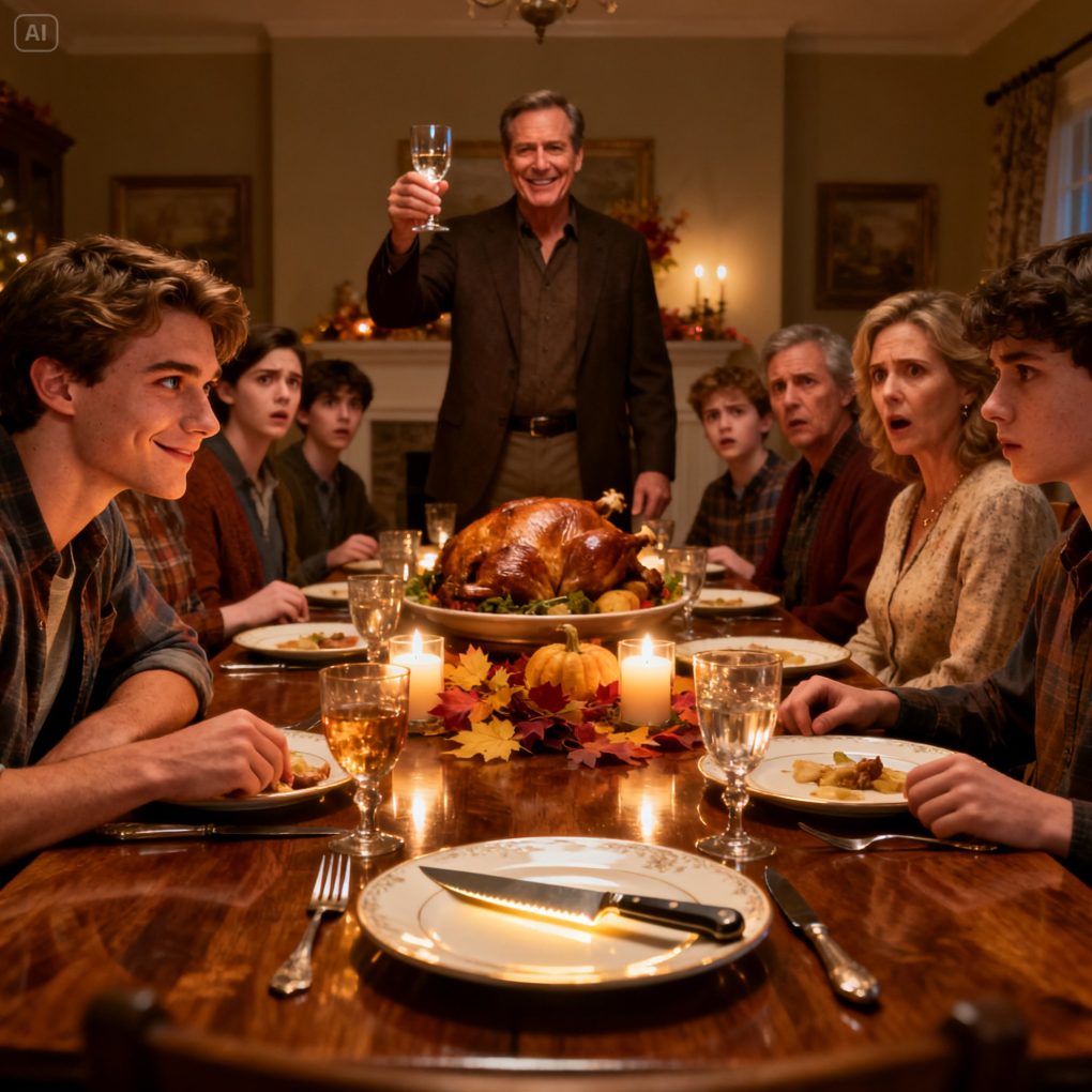 Halfway through dinner, he stood up, lifted his wine glass, and tapped it with a fork. The room quieted instantly. Even the turkey seemed to stop steaming.