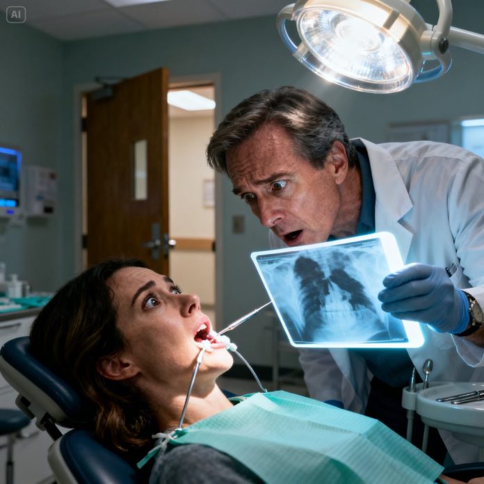While lying in the dentist’s chair, I suddenly heard him whisper, “We need to call 911. Right now.” I froze, unable to speak as my mouth was numb. He held up the X-ray, eyes locked on mine: “This… just saved your life.” My heart pounded, the room shrinking around me. Ten minutes later, when the door swung open, I finally understood just how serious everything was…