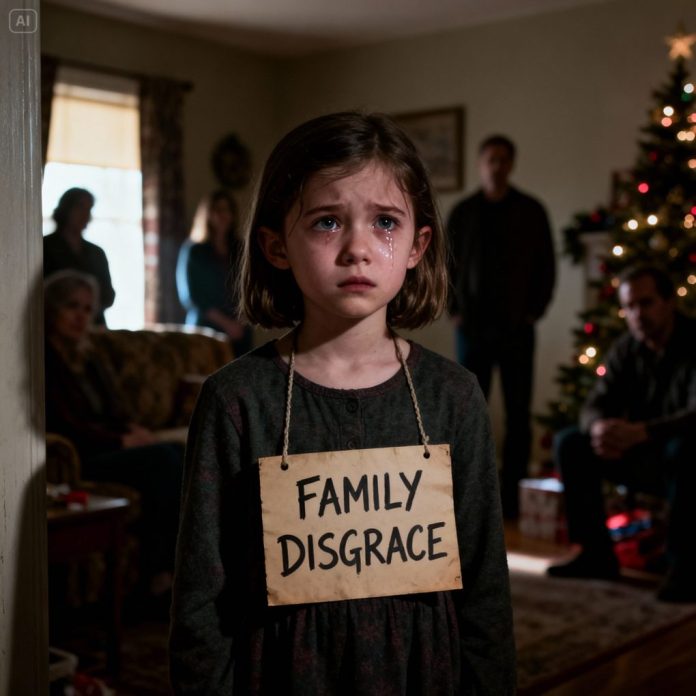 While Sarah was at her office, her family decided to brand Emily in the harshest way possible. They labeled her a “liar,” forced her to wear a humiliating sign that read “FAMILY DISGRACE,” and left her alone and hungry in a cold corner of the living room for hours. When Sarah’s co-worker messaged her about Emily’s strange silence on the phone, a sinking feeling took over her. She rushed home, heart pounding.
