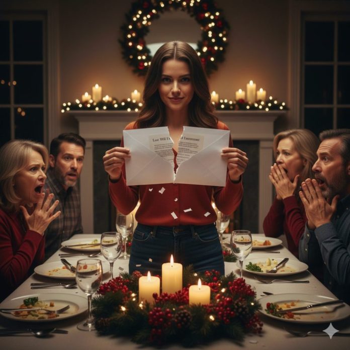 “That winter, the hatred in my family peaked. In the middle of Christmas dinner, my sister looked straight into my eyes, her voice cold as ice: ‘We’ve all decided—you should leave and never come back.’ I just smiled, pulling out the envelope I had carefully hidden. ‘Okay then. I guess you won’t be needing THIS.’ Under their horrified gaze, I ripped it into tiny shreds, letting them fall to the floor. When they realized what I had just destroyed, my mother’s scream tore through the festive air. I turned and walked out, knowing I had just burned a bridge, but also their ‘golden ticket.’”