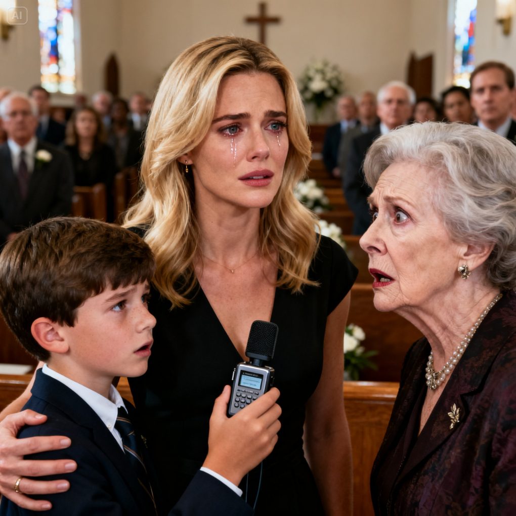In the quietest moment of the funeral, his mother turned to me in front of everyone and said, “You are the final disgrace of my son.” No one even dared to breathe. Then my eight-year-old child stood up, wiped their tears, and asked clearly, “Grandma… should I play the recording Dad made about you?” Their entire family went pale. No one had realized… the child had heard everything before he passed away.