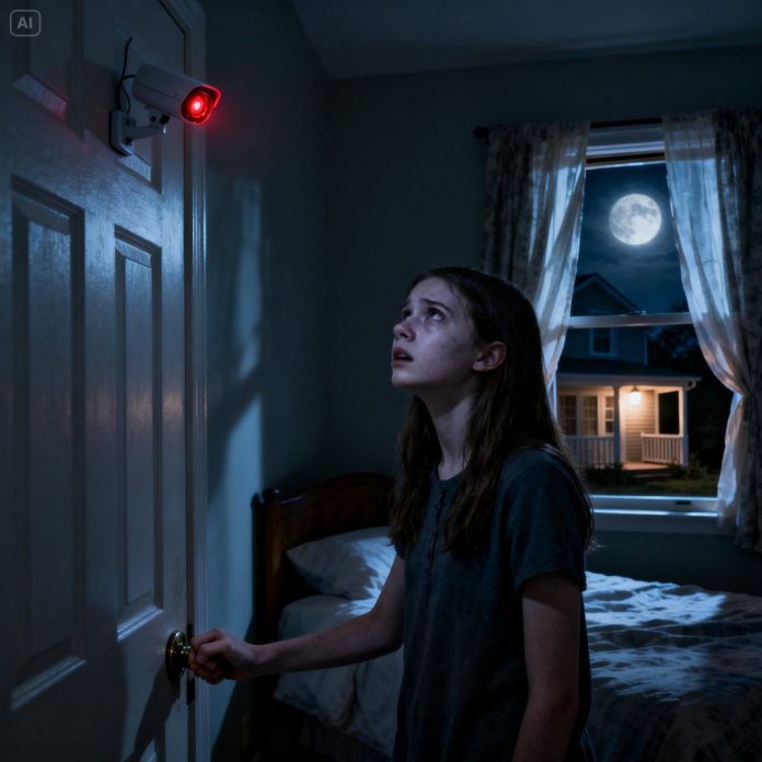 It was mounted high in the hallway, angled carefully—deliberately—so it caught my bedroom door. When the door was open, it saw my bed. My dresser. The corner where I changed clothes when I thought no one was watching. When the door was closed, the red light still burned through the crack underneath.