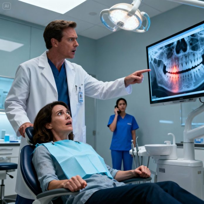 In the middle of a routine dental procedure, my dentist suddenly stopped and said, “We need to call 911. Right now.” I was completely confused until he turned the screen toward me and showed me my X-ray. Pointing at it, he said quietly, “This just saved your life.” Ten minutes later, as the paramedics rushed in, I realized that what I thought was a normal appointment had turned into a moment that would change everything.