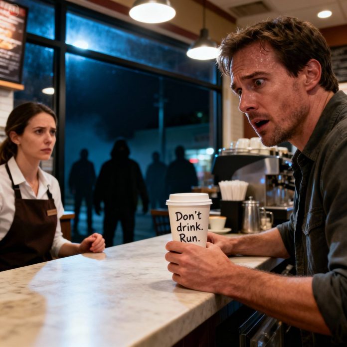 The barista wrote on my cup: “Don’t drink. Run.” I looked up. She met my eyes and shook her head: “You’re not safe.” My heart pounded as I set the cup down. I stepped outside—and saw someone waiting in the shadows. Three minutes later… I understood why that warning had just saved my life.