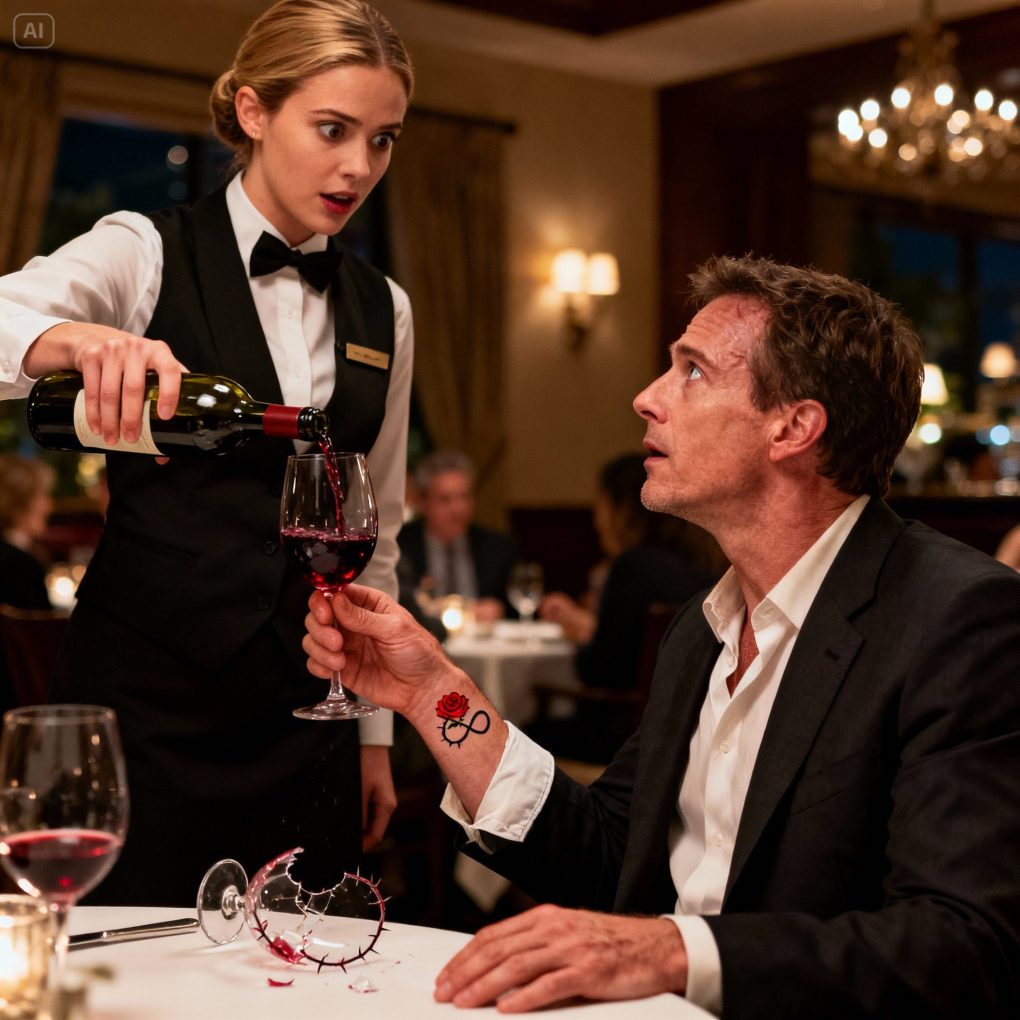 I’m a waitress, and last night a billionaire walked into the restaurant where I work and ordered a glass of wine. When he reached for it, I noticed a tattoo on his wrist—a small red rose with thorns forming an infinity symbol—and I froze, because my mother has the exact same tattoo, with the same design on the same wrist. I said, “Sir, my mother has a tattoo just like yours,” and he dropped his wine glass, shattering it on the floor. Then he asked for my mother’s name, and when I told him, he went completely pale.