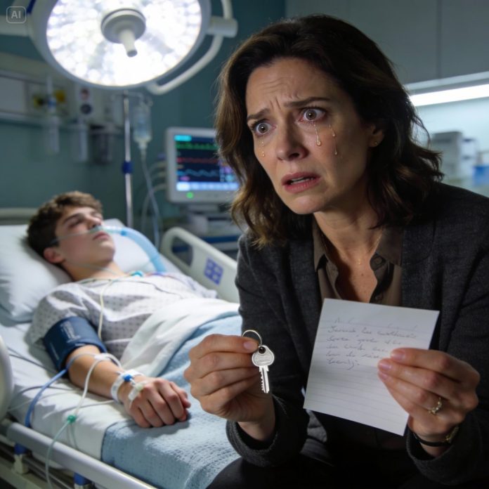 I walked into my son’s hospital room after the accident had left him in a coma. The doctor said, “The chances of him waking up are very low.” My husband left without a word, leaving me alone by my son’s bedside. As I reached out to take his hand, a small key fell out of his pocket. Along with it was a piece of paper with shaky handwriting: “Mom, please use this to open what’s inside.”
