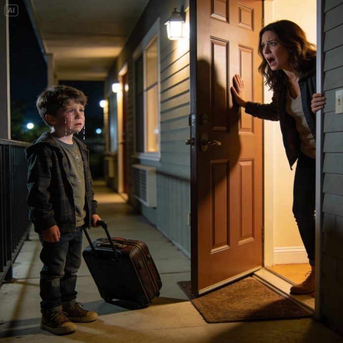 When I opened it, Lucas stood there alone. His eyes were red and swollen from crying. One hand dragged a small blue suitcase across the porch.