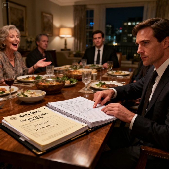 My mom mocked me for renting a shoebox while my brother lived in a penthouse. “Such a failure,” she laughed at dinner. I stayed calm and placed the ledger on the table. “I just want to confirm something.” When I pointed to the owner’s name, the laughter died. I said softly, “He’s my tenant.” And I already had the eviction notice in hand.