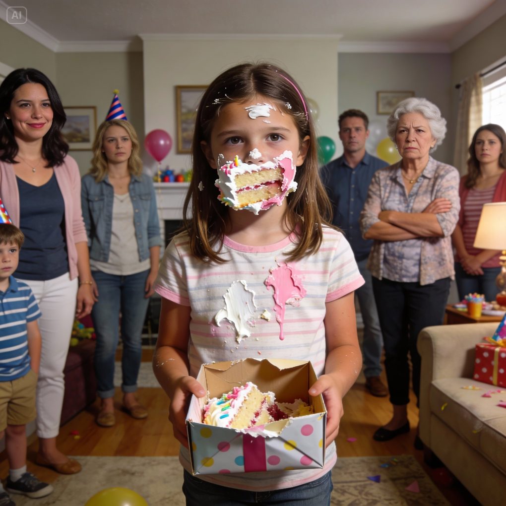 At my daughter’s 7th birthday party, my sister unexpectedly smeared the cake straight in her face. “Happy birthday! Surprise!” she yelled. My mother laughed loudly: “That’s hilarious!” My daughter stood still, her face covered in cake cream. Then she looked at me and said: “Mom, can I show everyone the present now?” Their smiles froze instantly.