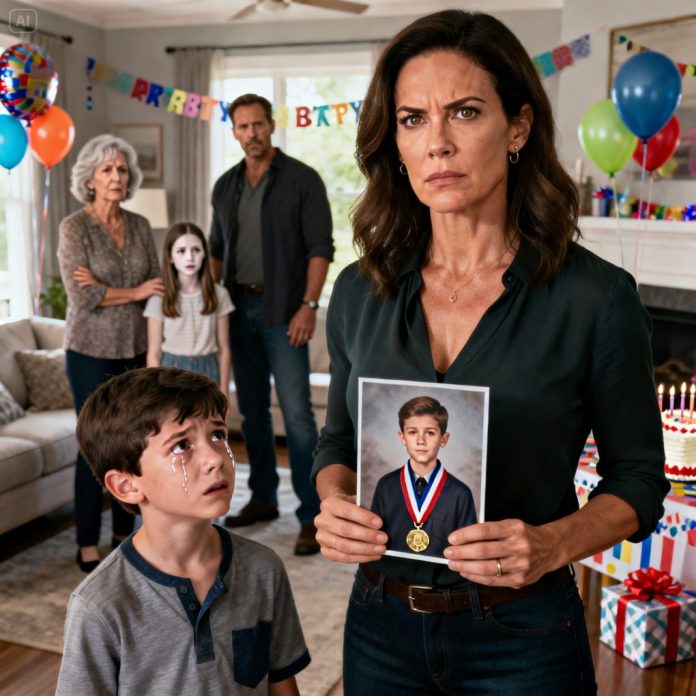 At my sister’s son’s ninth birthday party, the living room was packed with balloons, loud music, and the kind of forced smiles that only appear at family gatherings. I stood near the wall with my son, Ethan, his small hands clenched in front of him, while my parents hovered proudly around my sister, Laura, and her child, Noah. From the very beginning, it was clear who the center of attention was supposed to be.