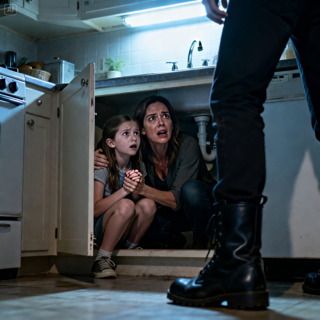 Emily pulled me toward the kitchen. Without thinking, I followed. We squeezed into the cupboard beneath the sink, knees pressed against cleaning supplies, the smell of detergent sharp in my nose. I held my breath as footsteps moved across the living room floor.