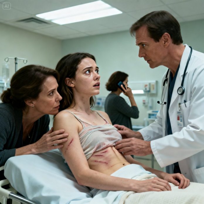“He broke my ribs,” I whispered in the emergency room. My mother leaned in close and murmured coldly, ‘Stay quiet. He still has a future ahead of him.’ I thought I was about to be abandoned all over again. Then the doctor examined the bruises, met my eyes, and said softly, ‘You’re safe now.’ She turned away, picked up the phone… and in that moment, I knew everything was about to change.