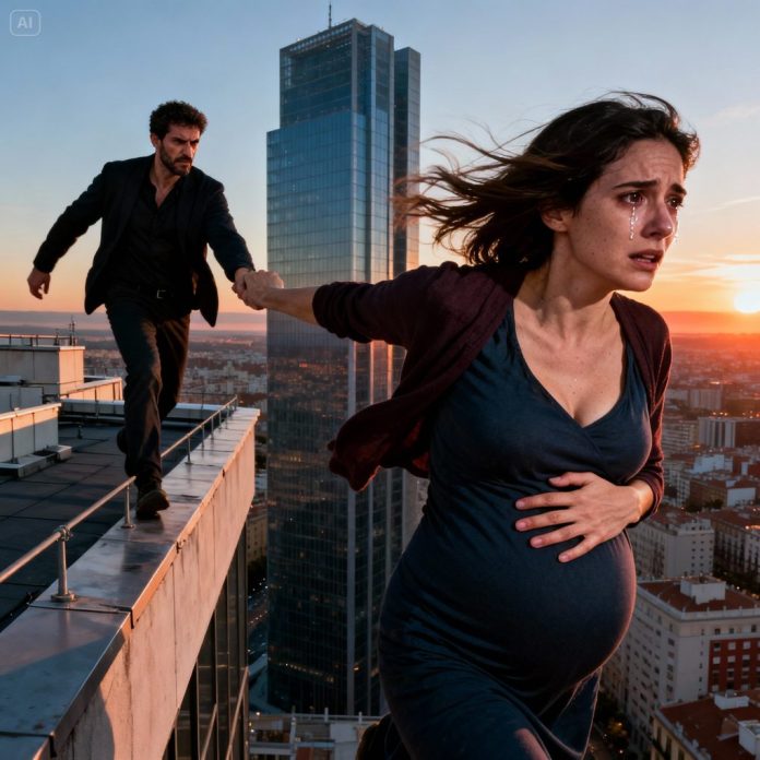 Cuando tenía ocho meses de embarazo, mi esposo Javier me llevó a la azotea de un rascacielos en el centro de Madrid. Dijo que quería “respirar aire”, que necesitaba hablar. Yo estaba cansada, con los pies hinchados, pero confié en él. Llevábamos diez años juntos, o eso creía. La ciudad brillaba abajo cuando Javier se giró y me miró con una frialdad que nunca le había visto.
