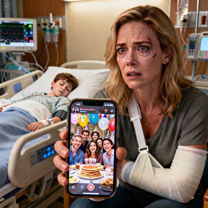 The night my eleven-year-old son, Ethan, and I were hit by a drunk driver, the world narrowed to flashing lights, glass on asphalt, and the sound of my own breathing trying not to panic. I am Laura Bennett, thirty-six, a single mother, a project manager who plans everything—and that night, nothing followed a plan. At the hospital, while Ethan slept with a concussion monitor taped to his head and my left arm throbbed in a sling, I sent a message to our family group chat. “My son and I are in the hospital. We’re alive, but very shaken.”