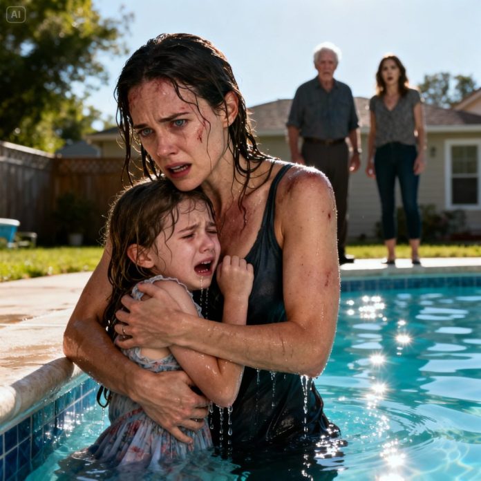My sister pushed my daughter into the pool—still in her dress, unable to swim. I rushed forward, but my father grabbed me by the neck and forced me down. “If she can’t handle the water, she doesn’t deserve to live.” In that moment, my heart felt like it was being torn apart. After pulling my exhausted, water-choking child out, I didn’t scream. I didn’t cry. I just looked at them one last time—long, cold, and silent. Then I walked out of that house for good. They had no idea I would take away everything they ever valued… and by the next morning, they finally began to understand.