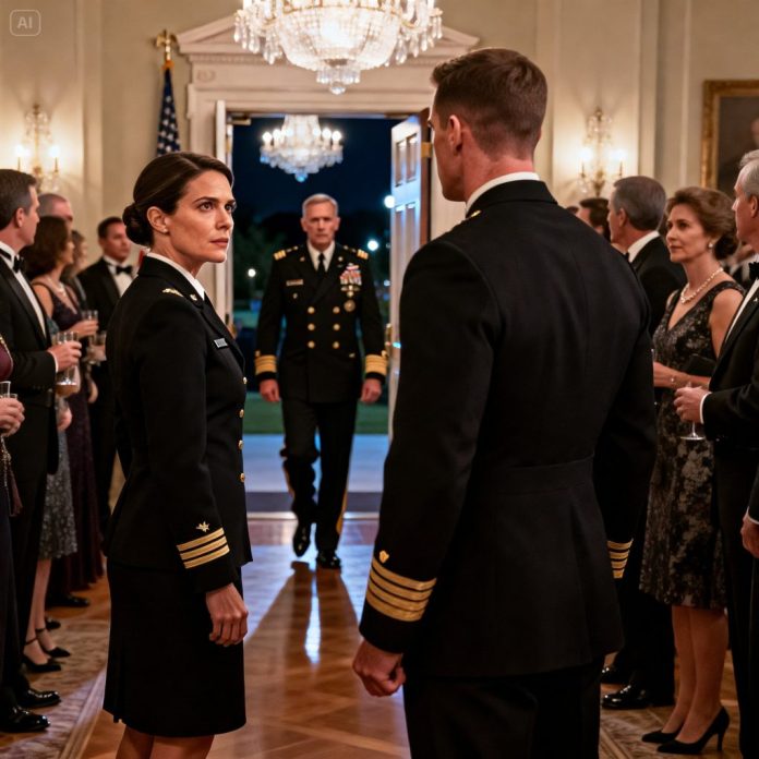 The ballroom was full of polished shoes and pressed uniforms, the kind of night where everyone smiles and pretends rank doesn’t matter—until it does. Navy blue and black gowns blurred together under chandeliers, and the band played soft jazz while people traded war stories in safer, edited versions.