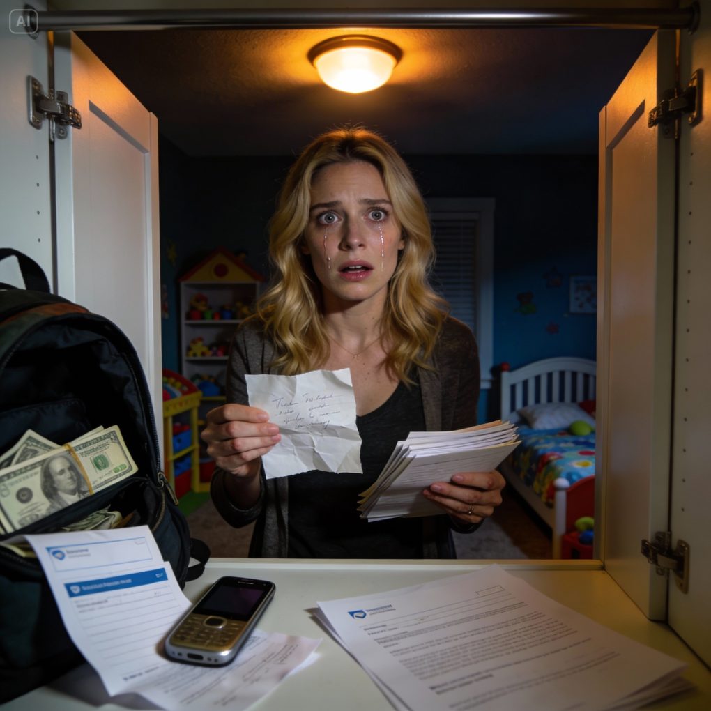 My hands shook as I opened the door. At first, everything looked normal—shirts, jackets, a pair of muddy sneakers. Then I noticed the backpack shoved behind the hanging coats. It was zipped tight, heavier than it should have been. Inside were things no eight-year-old packs without a reason: cash in small bills, a phone charger, printed emails, and a cracked old smartphone I had never seen before.