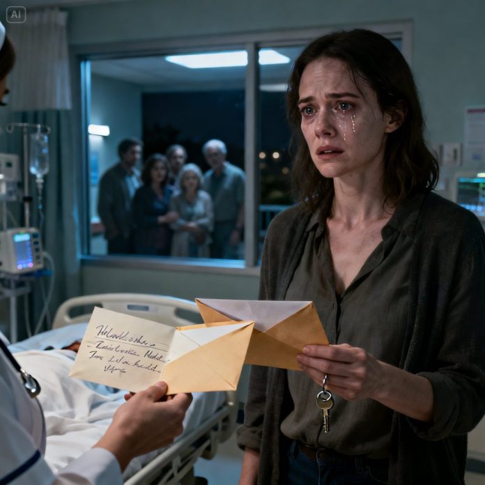 I stood alone by my mother-in-law’s hospital bed as the monitor went flat. Other rooms echoed with family voices—mine stayed silent. No husband. No friends. No calls. When the doctor marked the time, a nurse pressed an envelope into my hand and whispered, “She wanted only you.” Inside were names, a key, and one final line that made my stomach drop. That was the moment I realized her death wasn’t the end of my isolation—it was the beginning of a reckoning.