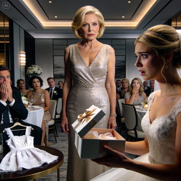 At my daughter’s wedding, her mother-in-law handed her a gift box. Inside was a maid’s uniform. My son-in-law laughed and said, “That’s exactly what she’ll need at home.” My daughter’s hands trembled, her eyes filled with tears. I calmly stood up and said, “Now let’s open the gift I brought.” When my daughter lifted the lid of the box, the entire room fell into stunned silence…
