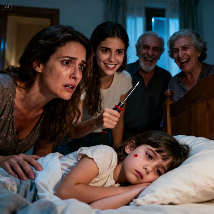 A las dos de la mañana, el sonido seco me despertó como un latigazo. Abrí los ojos y vi a mi hermana Lucía de pie junto a la cama de mi hija Sofía, de seis años. En su mano brillaba un destornillador. Con un gesto rápido y cruel, le dio un golpecito en la mejilla mientras dormía. No fue profundo, pero fue suficiente para helarme la sangre. Sofía no lloró. No gritó. Se quedó completamente quieta, como si su cuerpo hubiera decidido desaparecer para sobrevivir.