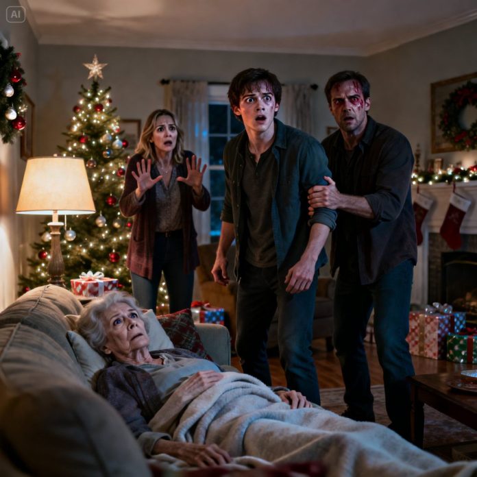 I came home on Christmas night without warning. But instead of music and smiles, I found my grandma lying still, my family gathered around her like they were waiting for something. My mom looked at me, voice trembling. “Don’t… come closer.” I rushed forward. “Grandma!” That’s when my dad grabbed my arm, eyes bloodshot. “It’s too late…” I didn’t understand—until my grandma suddenly opened her eyes and whispered one sentence that froze my blood.