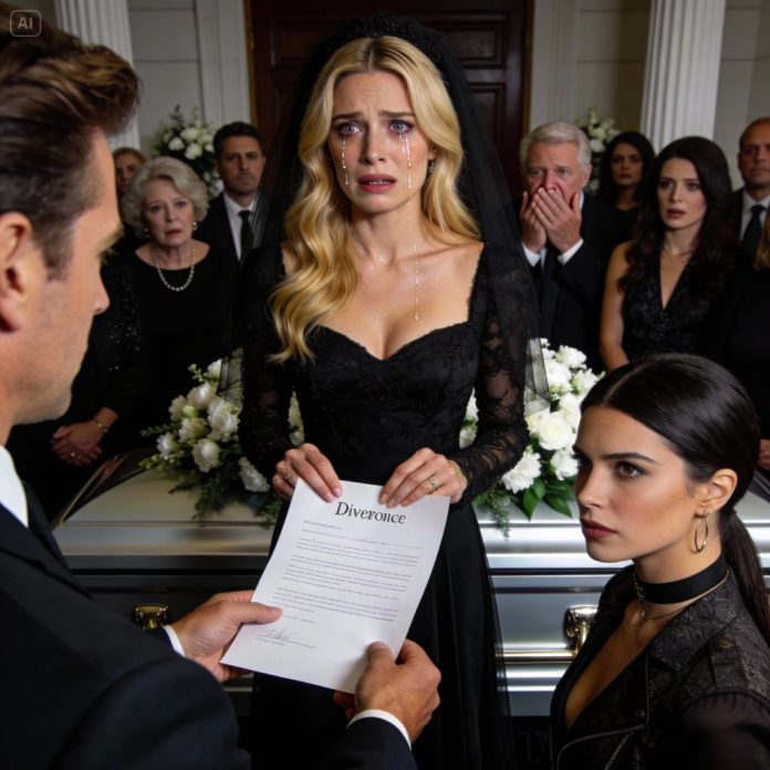 I opened the envelope and saw the word Divorce printed in bold. My hands began to shake. I whispered that this wasn’t the time. Daniel leaned closer, his voice low and precise. “Your dad would want you to do the right thing,” he said. Around us, my mother stared, my aunt covered her mouth, and someone dropped a glass that shattered against the floor.