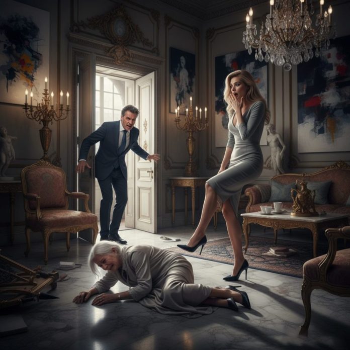 Michael followed the noise down the hall, his steps quickening until he reached the living room. The sight before him nearly brought him to his knees. His frail mother was crumpled on the floor, trembling and crying, while Rebecca stood over her with one stiletto heel raised. Michael’s heart thundered in his chest as he realized what he was seeing: his fiancée kicking his defenseless, demented mother.