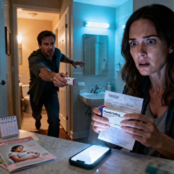 My husband’s best friend stepped out of our bathroom holding a box of medication, his face drained. “Wait… I thought you guys were trying for a baby?” I froze. My husband lunged and snatched it, hissing, “Give it to me!” I stared at them, my heart hammering. “Explain.” He forced a smile. “You’re misunderstanding.” But his friend whispered, almost terrified, “No… you need to see the name on the prescription.” I grabbed it—and what I read made my blood run cold.