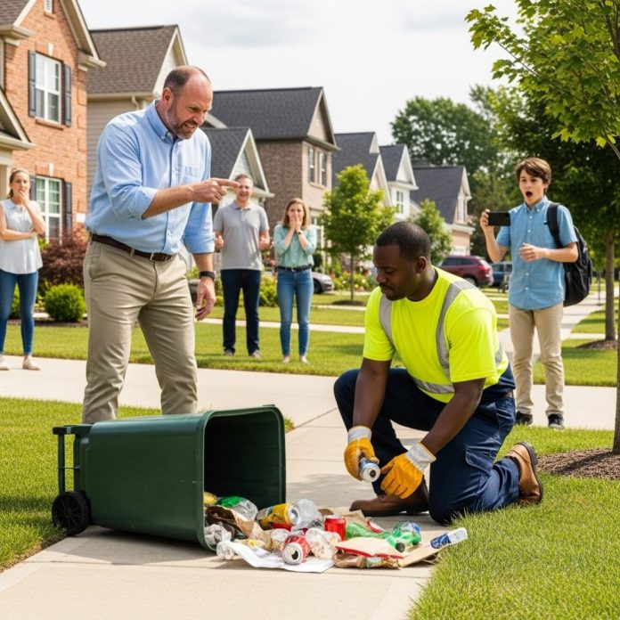 As Marcus carefully returned one of David’s bins, David suddenly kicked over another, scattering trash across the curb. With a sneer, he said loudly, “Clean it up. That’s your job. Black people like you should be used to this kind of work anyway.”