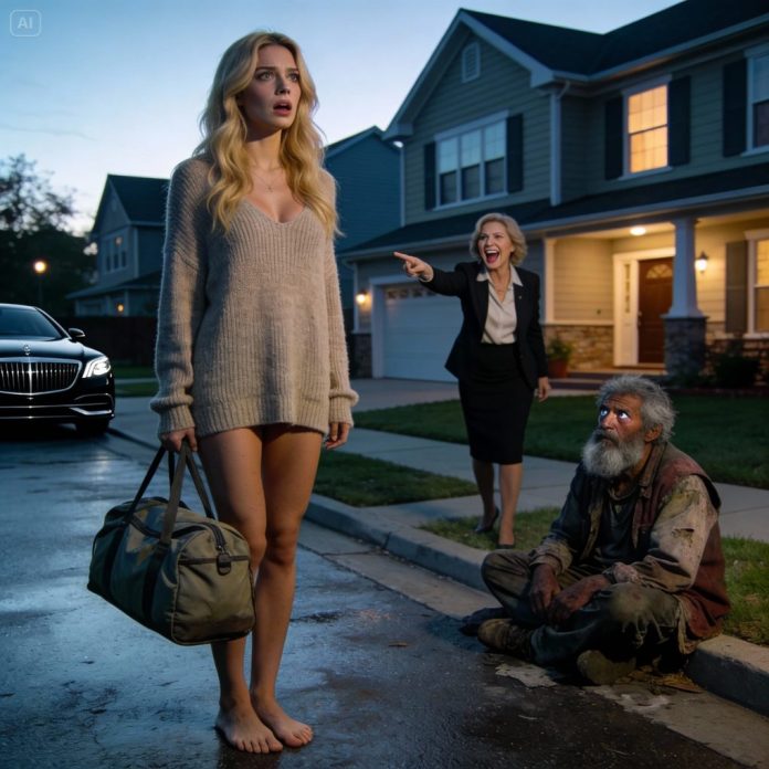 She dragged me across the cracked pavement toward the old bus stop at the corner, where a man sat wrapped in a filthy coat. His beard was gray, his shoes torn, and a cardboard sign rested beside him. Veronica shoved me forward so hard I nearly fell. She tossed my small duffel bag after me and sneered that people like us belonged together. Then she turned back toward the house, still laughing, as if she had just thrown out trash.