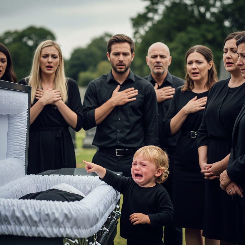 As the priest said his final words, Emily held Noah close. She had hoped that the boy, so young and innocent, wouldn’t fully understand what was happening. She was wrong. Noah, who had been quiet throughout the ceremony, suddenly started to stir. His small hand reached up and pointed toward the coffin, his eyes wide with confusion and fear. Emily gently shushed him, but it was as if the boy couldn’t hear her. He was fixated on the casket, and his little finger trembled as he pointed toward it. “Daddy… daddy,” he whimpered, his voice strained with emotion.