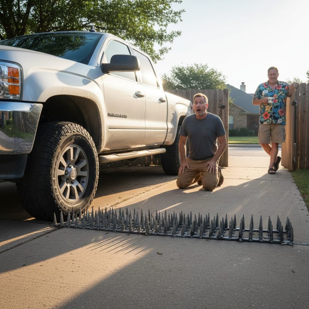 Stretching across the mouth of his driveway were three long strips of heavy-duty tire spikes, the kind you’d expect to see at a police checkpoint. His heart raced as he realized that if he had backed his truck out without noticing, both his tires and his weekend plans would have been ruined.