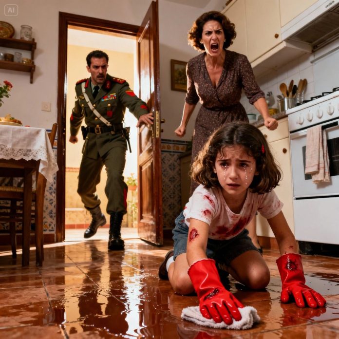 Lucía llevaba semanas así. Desde que Andrés, su padre, había sido destinado a una misión prolongada, la casa se había convertido en un lugar hostil. Marta justificaba cada castigo diciendo que la niña era torpe, desobediente, una carga. Esa tarde, el cansancio pudo más. Las fuerzas abandonaron a Lucía y su cuerpo se desplomó sobre el suelo, jadeando, con lágrimas silenciosas mezclándose con el agua sucia.