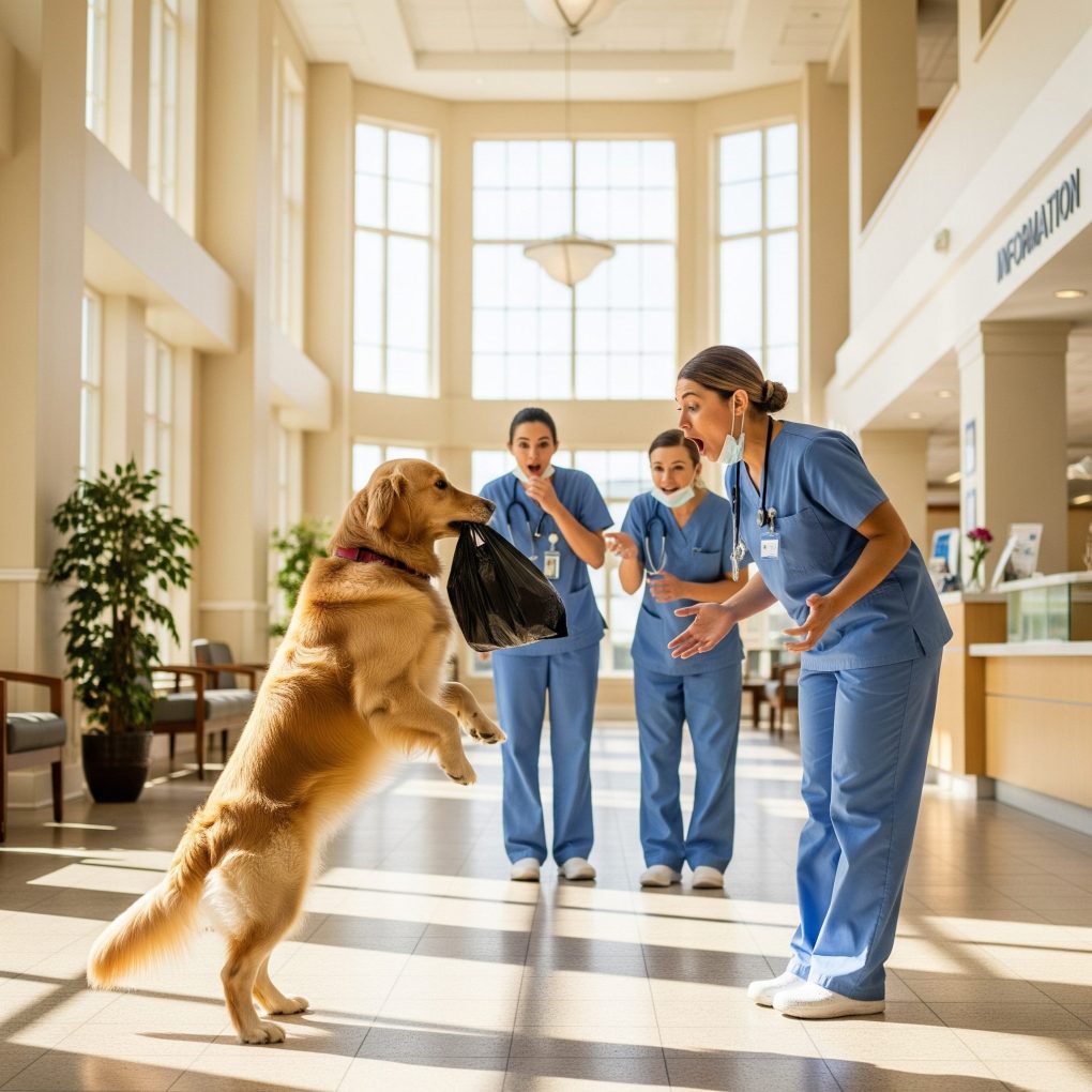 It was a warm Tuesday afternoon in Springfield, Illinois. Dr. Robert Collins, a respected emergency physician with nearly twenty years of experience, was finishing up a routine check on one of his patients when the automatic sliding doors at the hospital’s entrance opened. What walked in was not an ambulance crew, nor a patient in distress, but a small, trembling golden-brown puppy. The animal was thin, with ribs faintly visible under its fur, and it walked with an uncertain limp. Clenched tightly in its jaws was an old black gym bag, frayed at the edges and stained from use.