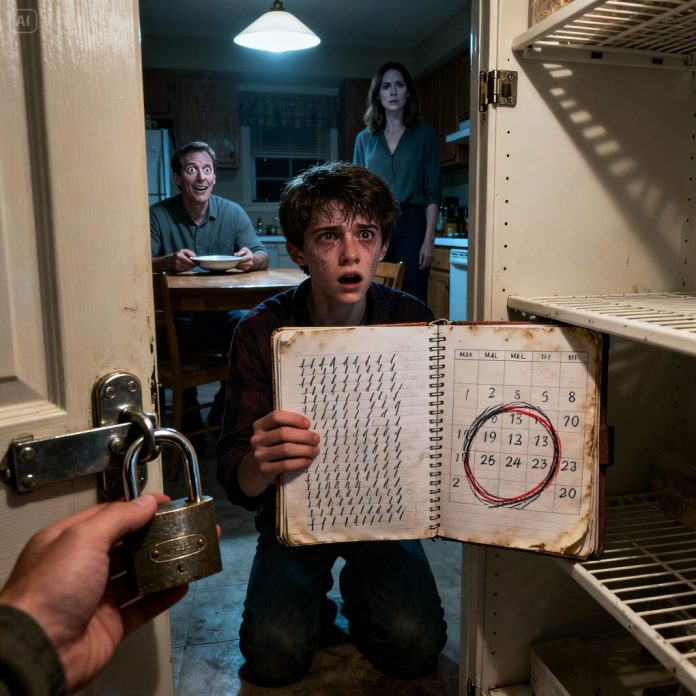For three years my dad sat across from me at dinner, laughing, passing dishes, acting like everything was normal—yet my plate stayed empty every single night. “You’re not hungry again?” he’d say, never once looking at my hands shaking under the table. The night I finally whispered, “Dad… I haven’t eaten in days,” he froze, then my mom snapped, “Stop being dramatic.” That’s when I checked the pantry lock… and found the notebook with every meal counted—like I was a punishment. And the last page had tomorrow’s date circled.