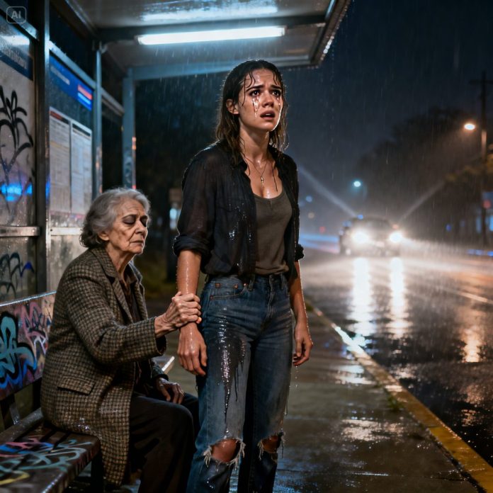 I was standing alone at a bus stop, broke and shaking, when my husband drove away and didn’t look back. Then a blind old woman grabbed my wrist and whispered, “Pretend you’re my granddaughter. He’ll regret this.” My heart slammed. Minutes later, headlights appeared in the dark. I didn’t know who she really was—but I knew my life was about to flip. What happened next still haunts me.