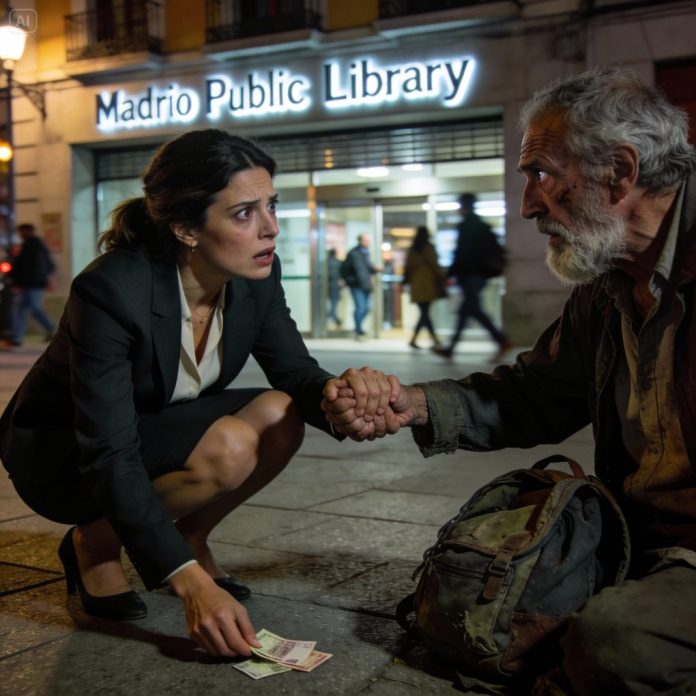 Tras la muerte de mi marido, Javier, mi vida se redujo a rutinas silenciosas y a un cansancio que no se iba ni durmiendo. Conseguí un nuevo trabajo como administrativa en una empresa de transportes cerca de la biblioteca municipal de Madrid. Cada mañana pasaba por la misma esquina y, frente a la entrada lateral de la biblioteca, siempre estaba Don Manuel, un anciano sin hogar de barba canosa y mirada alerta. Nunca pedía nada en voz alta. Solo asentía cuando alguien le dejaba una moneda.