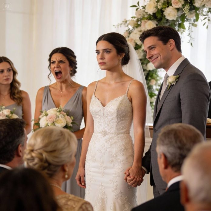 My sister’s voice sliced through the ceremony so sharply that even the music stuttered to a stop. Every head turned. Every whisper froze mid-breath. She stood from her seat, face flushed with triumph rather than anger, pointing straight at the man holding my hand.