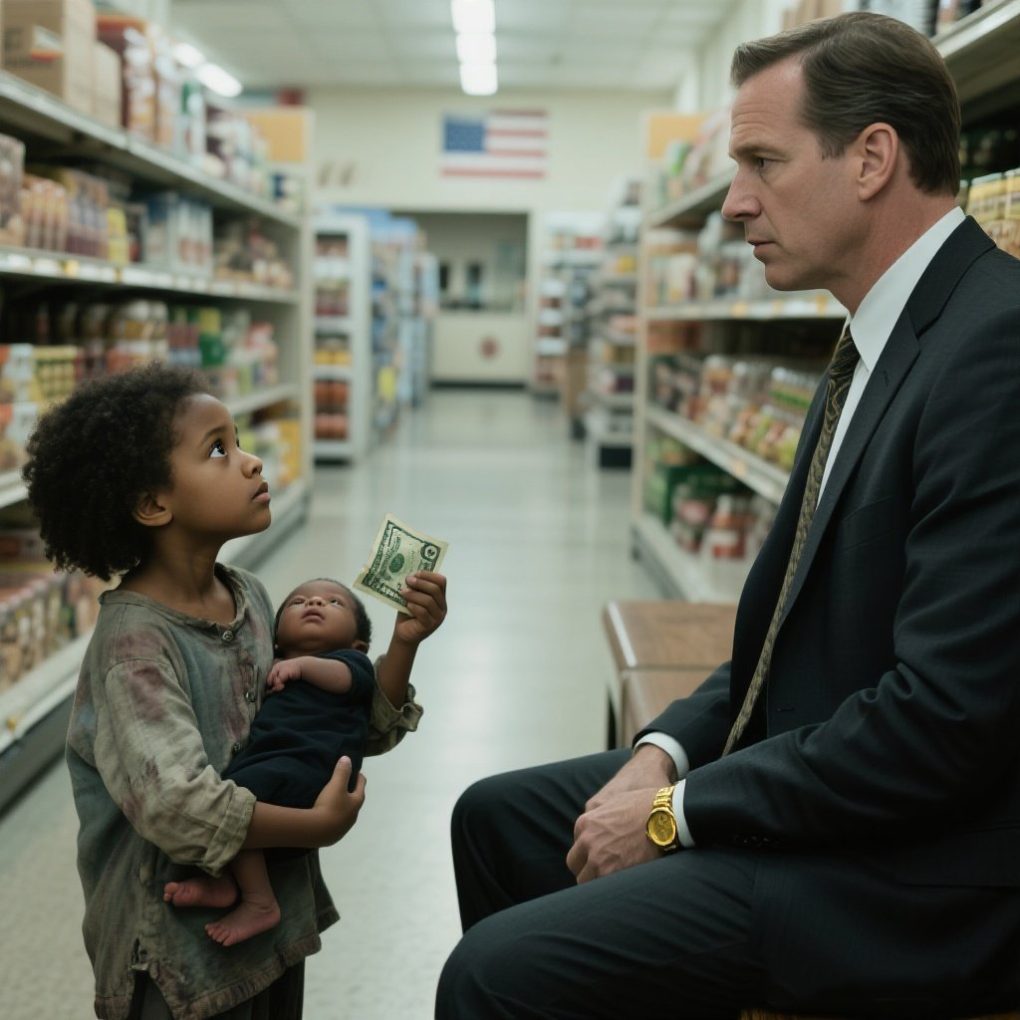 Summoning every ounce of courage, she approached him. “Excuse me, sir…” Her voice was small, almost swallowed by the air conditioning hum. The man looked up, surprised, his blue eyes meeting hers. “I… I don’t have enough money for my baby brother’s milk. Could you… please help me? I promise I’ll pay you back when I grow up.”
