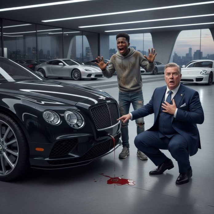 Michael hesitated. The boy’s voice quivered, but not with deception—with fear. He wanted to dismiss him, but something gnawed at his instincts. Against his pride, he crouched by the Bentley and peered underneath. The brake line was wet, glistening unnaturally. He touched it, brought his fingers to his nose, and the sharp chemical smell confirmed it—brake fluid had leaked away.