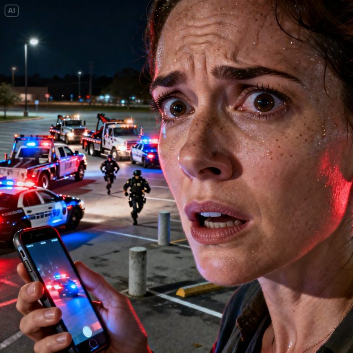 Ten minutes later, flashing lights flooded the parking lot as tow trucks and police swarmed in.